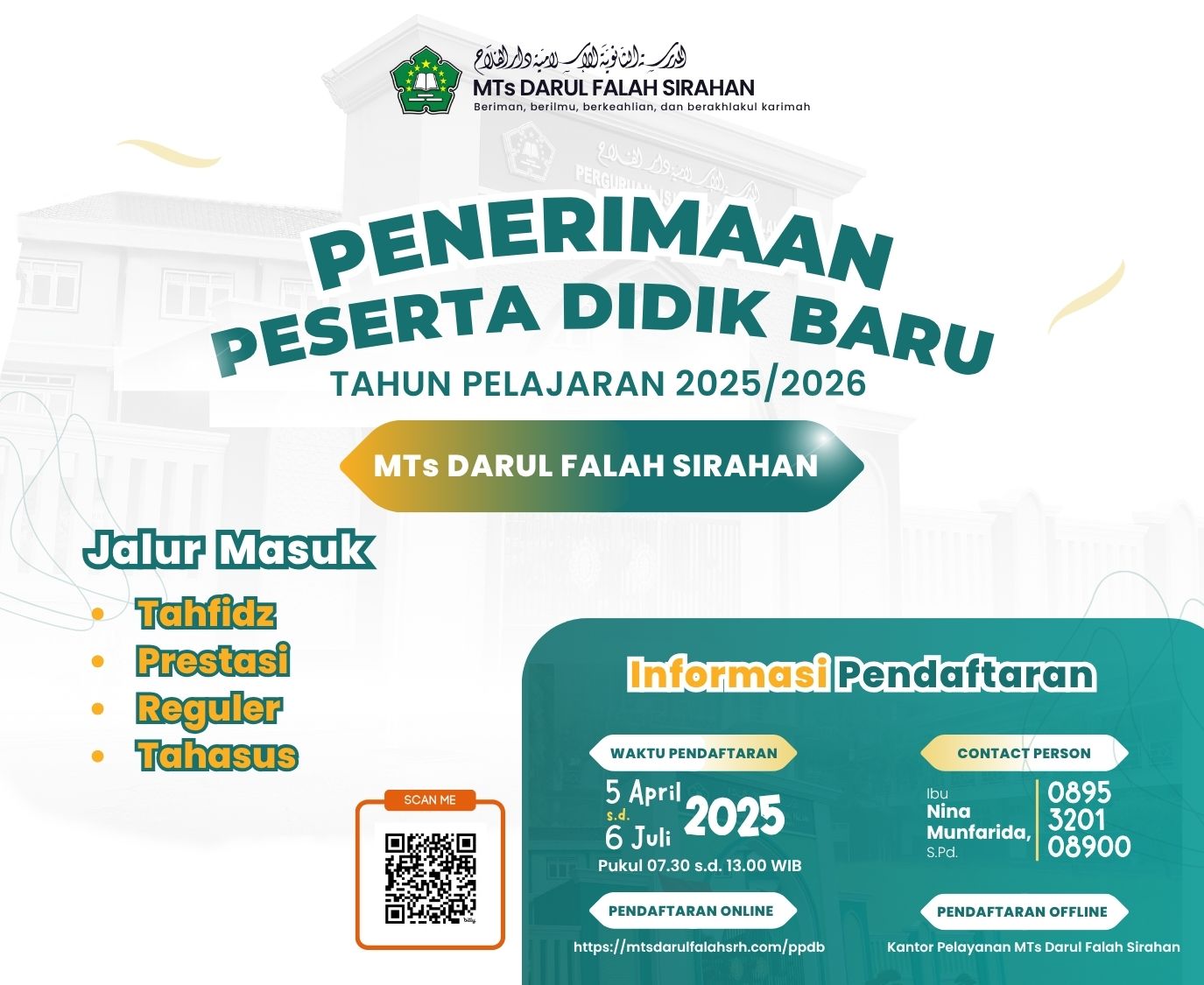 Mari bergabung dengan MTs Darul Falah Sirahan, bersama meraih keshalehan sosial, spiritual, dan intelektual.